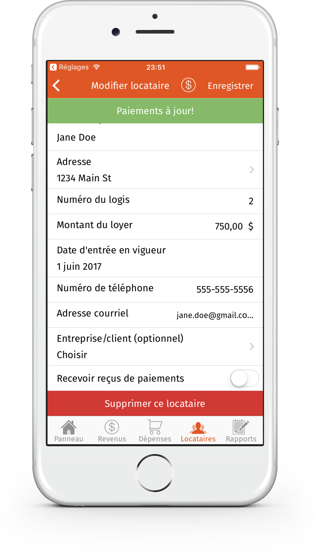 Accès à toute l'information au sujet des vos locataires. Faites leurs parvenir un reçu de paiement par courriel si désiré. Voyez immédiatement si ce locataire est à jour ou en retard dans ses paiements.